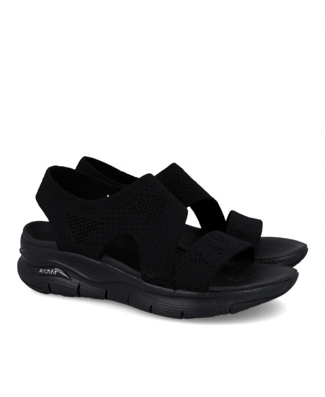 The Skechers Arch Fit - Brightest Day redefines the walking experience with women's flat sandals. This black model combines a sophisticated aesthetic with Skechers' technical functionality. Thanks to its construction with stretch material shoes, the sandal wraps the foot providing a firm yet extremely comfortable grip.